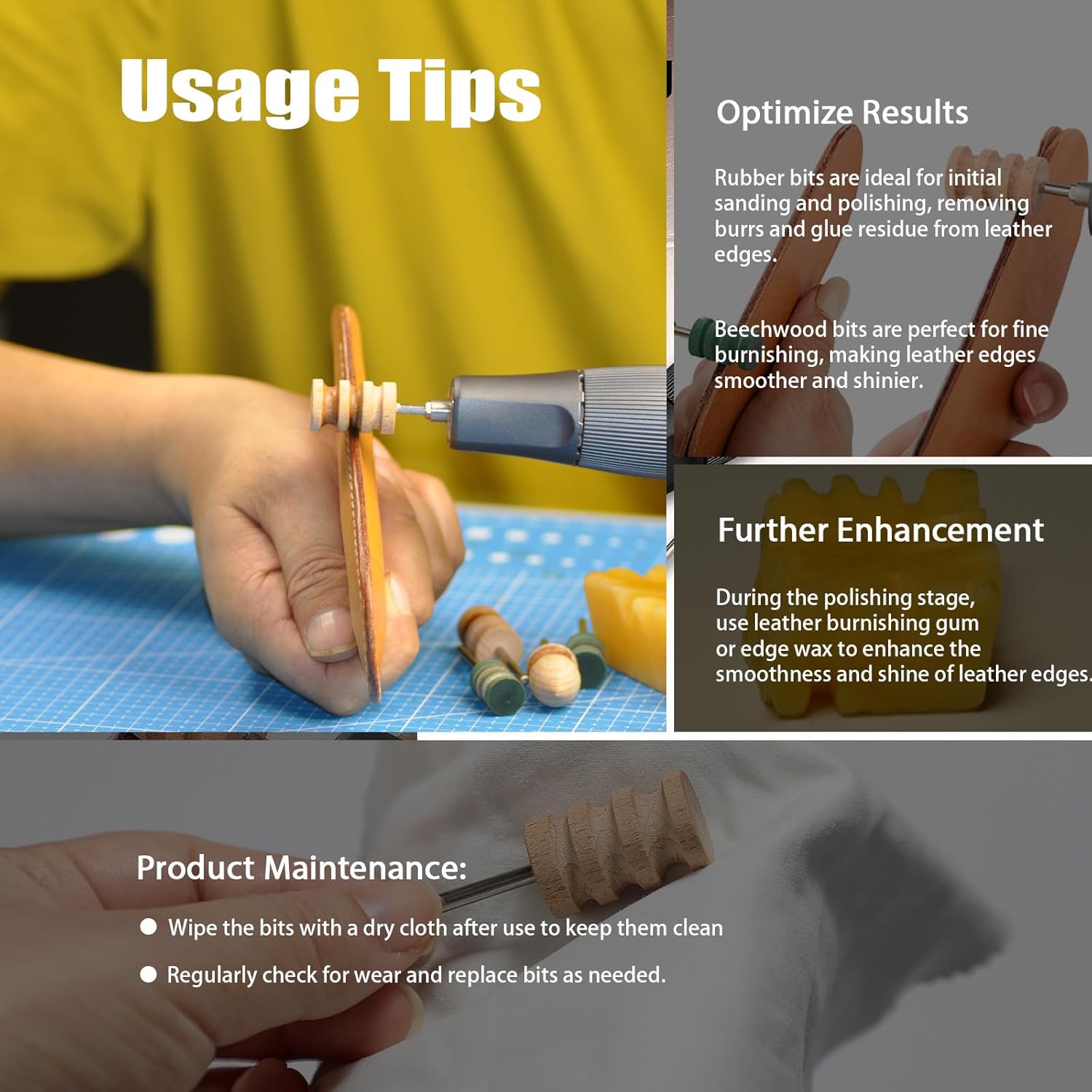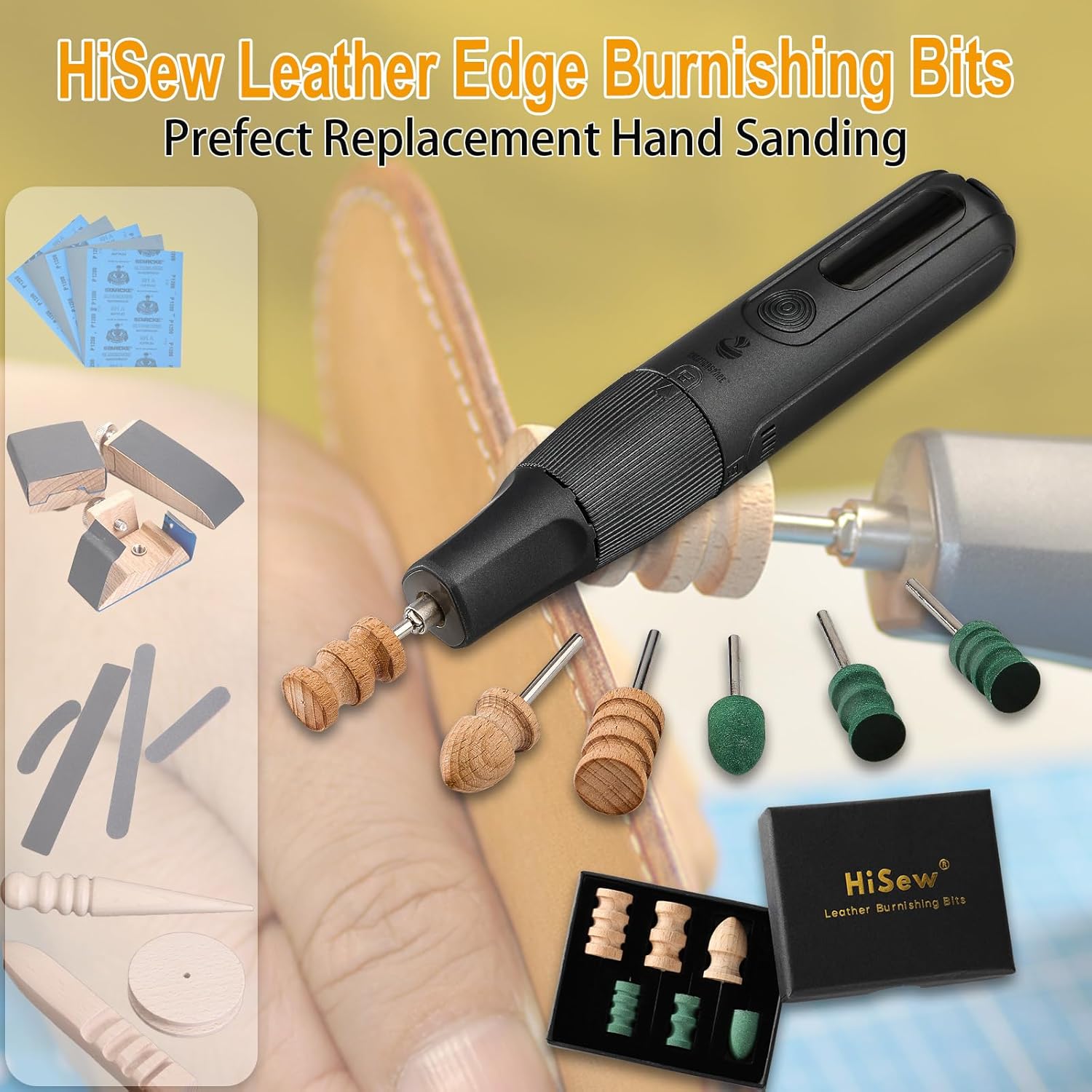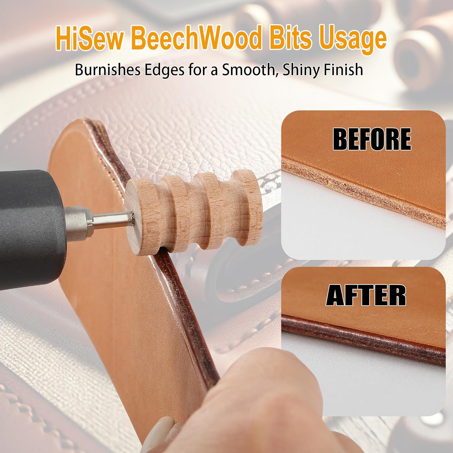 Hisew Leather Edge Burnishing Bits – Standard Set of 6 for Smoothing & Polishing Medium-Firm Leather Edges, Like Veg-Tan (400 Grit Sanding Bits + Beechwood Burnishers), Compatible with Rotary Tools